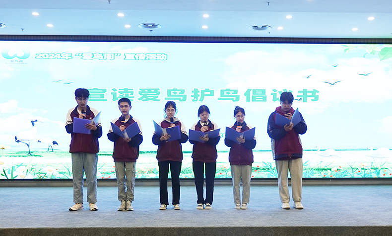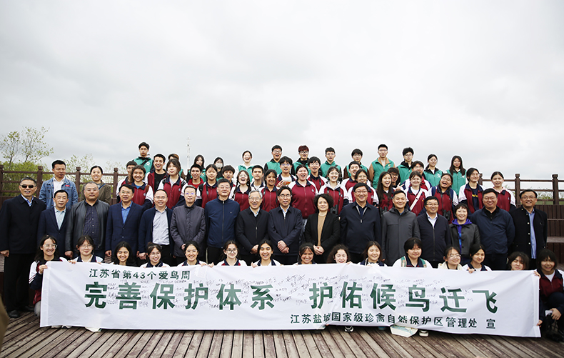 会上,盐城市田家炳中学新疆班六名学生代表现场宣读爱鸟护鸟倡议书,呼吁大家共同爱鸟护鸟,用实际行动做保护野生动物的忠诚卫士。与会领导为盐城春季黄渤海迁徙候鸟调查代表队授旗,并颁发“黄海湿地保护志愿者”证书。
