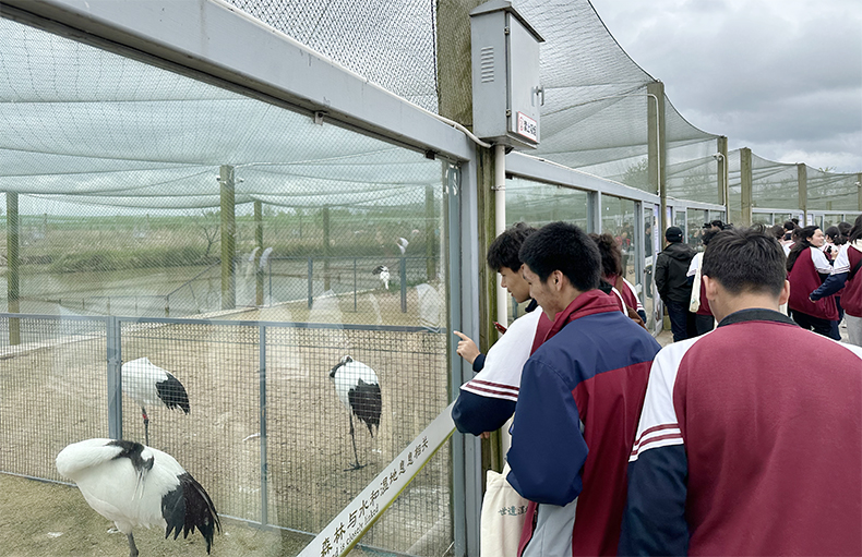 启动仪式后,大家一起观看丹顶鹤放飞训练。湿地学院教师带领新疆班的学生在保护区开展野外鸟类识别观察。在这里,他们手持望远镜,仔细观察着天空中飞翔的候鸟。每当有稀有鸟种出现,现场总会响起一阵阵惊叹声。新疆班学生阿依夏·阿不都那色同学激动的说:“我就像候鸟一样从新疆来到盐城读书学习,我也要参与到候鸟迁徙的保护行动中来,用自己的实际行动为鸟类保护、也为保护我们共同的家园贡献出自己的力量。”
