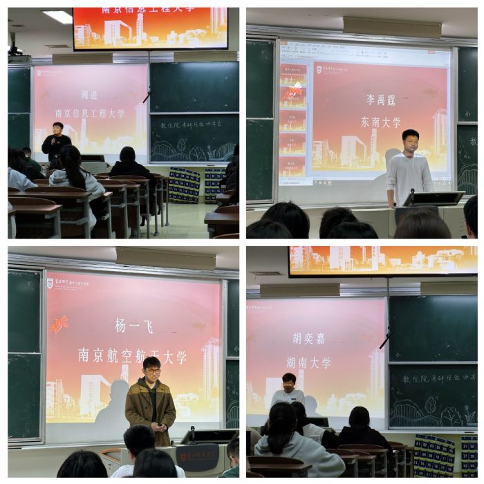 鲲鹏久有凌云志,硕果飘香又一年。为进一步帮助学生明确考研方向、熟悉备考流程、充分发挥朋辈互助、示范引领作用,4月17日,数学与统计学院在主楼B101教室举办职业发展规划暨考研交流分享会。交流会邀请学院2024届10余位考研成功“上岸”的优秀学生分享考研经验,学院200余名学生参与其中。