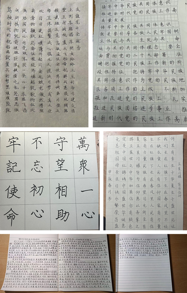 4月15日至20日,学院组织开展“铸牢中华民族共同体意识”书法作品展,通过书法展示活动进一步铸牢中华民族共同体意识,增强学生的文化自信。4月21日晚,学院围绕“民族团结”为主题开展艺术绘画活动,活动中,同学们用手中的画笔描绘出各民族具有代表性的服饰及人物形象,现场风格各异的民族人物形象勾勒出一幅“中华民族一家亲”的绘画长卷。学院还以班级为单位开展“讲好民族团结故事”主题好书推荐活动,各班级推荐民族团结相关经典书籍十余本。大家一致表示,通过阅读相关书籍,深刻认识到文化自信与民族精神培育的重要性,未来将传承和发扬中华优秀传统文化,为民族团结贡献青春力量。