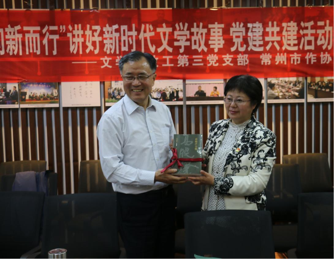 卞优文充分肯定文学院积极建设“江苏作家资源中心”、培养创意写作人才所取得的成果,并介绍常州市作协党支部立足常州文化名人的特色党建活动。李怀中向我院赠送了《高晓声全集》《行吟图》《运之河》等常州籍作家作品,分享了当代著名作家高晓声“为人民抒怀”的写作立场。
