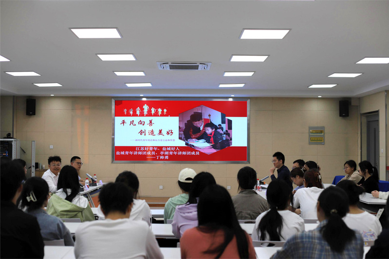 活动现场,历史与公共管理学院大学生志愿者作个人志愿服务事迹报告。盐城青年讲师团成员、江苏好青年、盐城师范学院校友、盐城市亭湖区心途公益服务中心理事长丁帅勇作《平凡向善,创造美好——新时代青年的诗和远方是公益和梦想》宣讲,丁帅勇用朴实的语言、真实的事例和真挚的情感,为大家讲述了自己从一名普通大学生成长为公益组织负责人的经历和感悟,让在场的青年志愿者对“什么样的青春才值得”的问题有了更深的理解。