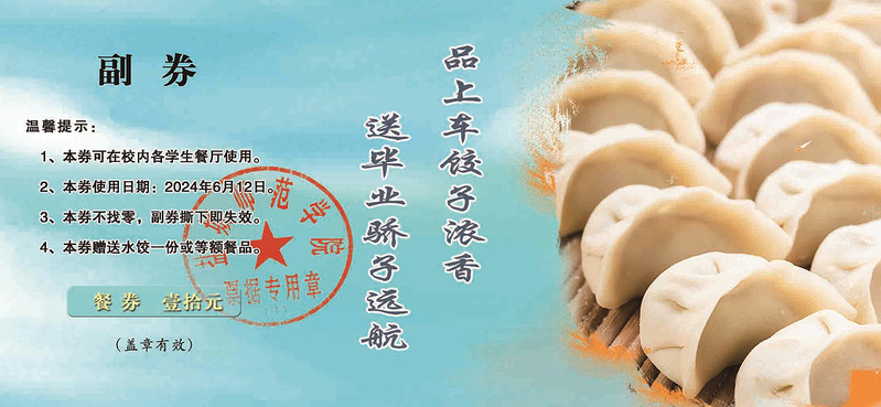 “送骄子,致远方”。在毕业生即将离开母校,踏上新征程之际,按照“上车饺子下车面”的传统习俗,后勤保障集团为2024届毕业生免费赠送面值10元的饺子券,让每一名毕业生在食堂都能吃上热腾腾的饺子。