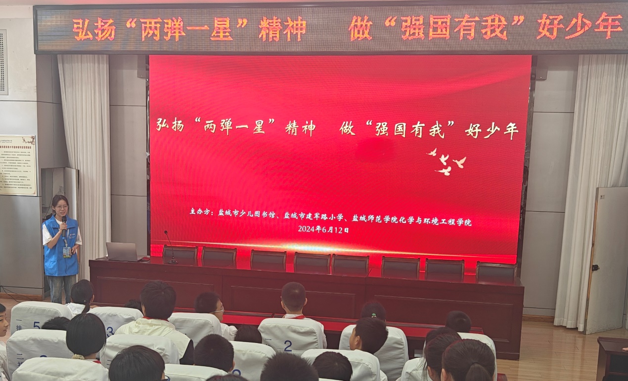 为弘扬“两弹一星”精神,激发新时代青少年的爱国情怀和科技创新意识,6月12日下午,化学与环境工程学院“两弹一星”精神志愿宣讲团赴盐城市建军路小学开展主题宣讲活动。