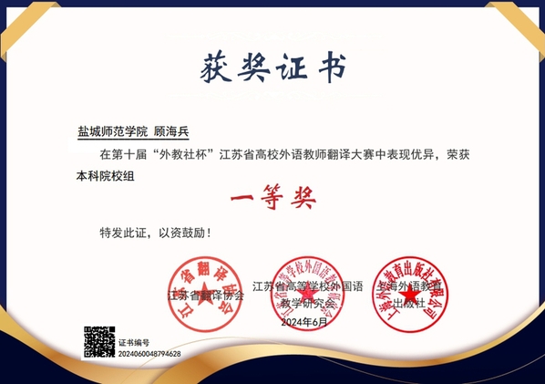 67日,第十届外教社杯江苏省高校外语教师翻译大赛圆满落幕,外国语学院教师顾海兵凭借扎实的专业功底和出色的翻译能力,荣获一等奖。