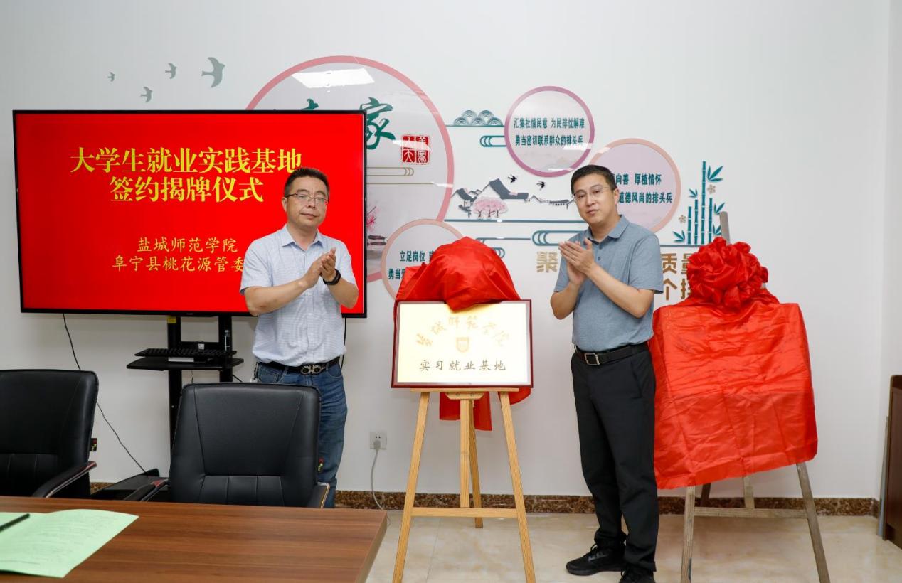 签约仪式上,盐城师范学院数学与统计学院党委书记孙玉峰与羊寨镇党委书记、桃花源党工委书记李磊代表双方签署了《盐城师范学院大学生就业基地协议书》,并共同为“盐城师范学院大学生实习就业基地”揭牌,数学与统计学院党委副书记左飞与桃花源管委会主任张善民为“盐城师范学院大学生社会实践基地”揭牌,盐城师范学院党委常委、副校长庞波和阜宁县常委副县长荣立国共同见证。此举旨在深度整合高校人才智力资源与经济区产业平台优势,建立常态化合作机制,为大学生提供了解乡村、服务基层、提升综合能力的优质平台,同时为羊寨镇及桃花源经济区的高质量发展注入源源不断的青春活力和创新动能,更是落实盐城市“黄海明珠人才计划”和大学生就业创业部署的具体行动。