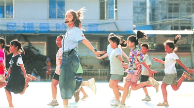 操场上,盐城师范学院支教大学生教孩子们跳舞。