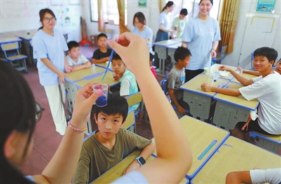 另一间教室里,盐城师范学院支教大学生吴方烨带着孩子们在做趣味化学实验,看到泡沫从瓶口不断涌出,孩子们一片惊呼。这一刻,科学不再是枯燥的公式,而是在指尖跃动的奇妙魔法。