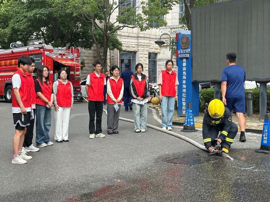 随后,全体人员移步社区广场进行实战演练。消防员展示了消防车的各项功能,现场示范了消防水带快速连接、展开以及高压水枪射水的标准操作流程。近距离的观摩学习,让大家对消防设备的使用方法和应急处置流程有了更直观、深刻的认识。同学们表示:“近距离观摩消防员熟练的操作流程,我深刻感受到消防工作的专业性和应急处置的紧迫性。作为新时代大学生,我们不仅要学好书本知识,更要积极投身社会实践,将所学知识转化为服务社区、守护平安的实际行动,为构建安全和谐的居住环境贡献自己的一份力量。”