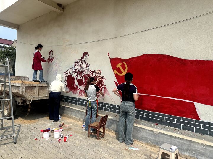 社会服务与美育传播亮点突出。实践团在徐州丰县、南京浦口等地开展爱心助老、防溺水宣讲等活动;“美育微课堂”团队走进常熟残疾人活动中心传授非遗扎染;在射阳合东党群服务中心联合剪纸非遗传承人开设“红色剪纸课”;连云港黑林镇的墙绘团队以“幸福是奋斗出来的”为主题创作墙绘,为乡村增添红色文化氛围。