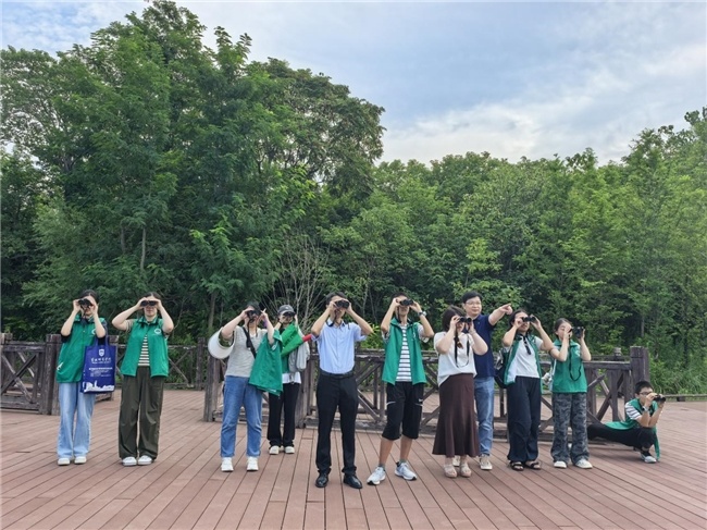 随后,团队深入湿地核心区开展实地调研。师生们手持专业设备开展鸟类种群监测,现场辨识候鸟种类、记录行为模式,将鸟类生态学课程中的理论框架转化为精准的观测技能。通过亲手操作、实时分析,大家深刻理解了湿地作为候鸟迁徙“驿站”的生态价值,也让课本上的“生态系统稳定性”“生物链平衡”等概念有了更生动的实践注解。