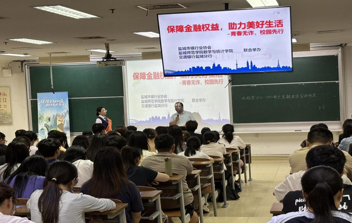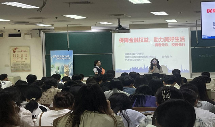 近日,数学与统计学院联合盐城市银行业协会、交通银行盐城分行举办“反诈宣传进校园”主题教育。学院党委副书记左飞主持活动,盐城市银行业协会消保部主任洪震、交通银行盐城分行副行长王欣齐出席活动,学院两百余名学生参加讲座。