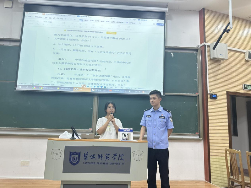 9月24日晚,物理与电子工程学院“一站式”学生社区举办“开学反诈第一课”专题讲座。本次活动邀请盐城经济技术开发区公安局于利之警官主讲,2025级200余名新生参与。