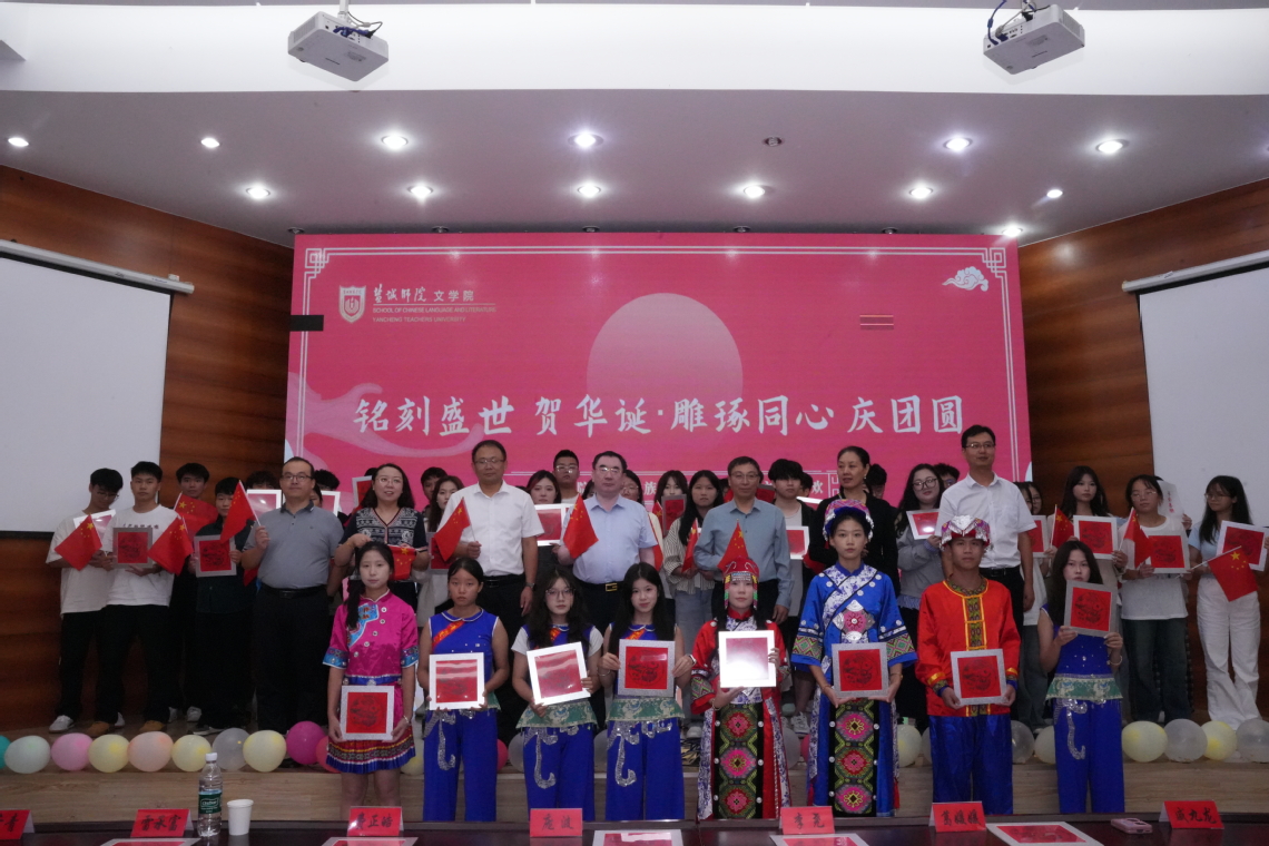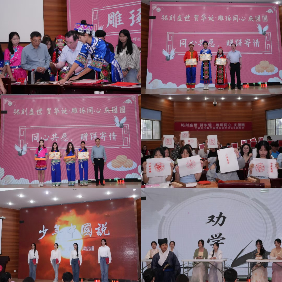 活动中,朗诵《少年中国说》生动诠释当代青年学子心系家国、报效祖国的凌云志向与赤诚热忱,国色今人汉服社《劝学》将中华传统服饰的华美与古典文学的深厚底蕴展现得淋漓尽致,充分展现学子积极向上的精神风貌。在非遗体验环节中,盐都区雕版印刷非遗项目负责人戚九龙现场演示雕版印刷技艺,师生亲手创作融合双节元素的雕版印刷作品,不仅让民族学生在亲手操作中直观感受传统技艺的独特魅力,更在潜移默化中增进对中华优秀传统文化的认同感、自豪感和归属感,促进了各民族文化的交流互鉴。