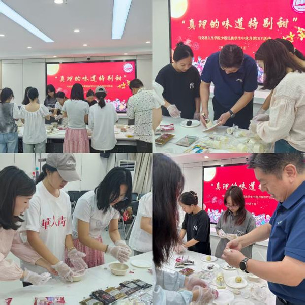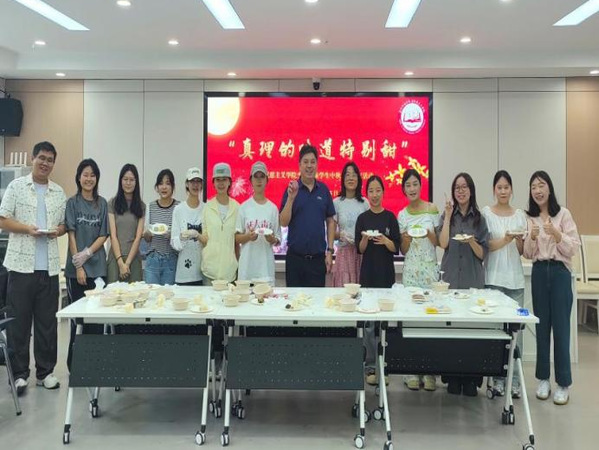 10月5日下午,马克思主义学院在博学楼A208开展“真理的味道特别甜”民族学生中秋月饼DIY活动。在月饼制作环节,同学们在老师的示范下认真学习揉制饼皮、包裹馅料、压膜成型等步骤。不一会儿,空气中便弥漫起月饼的香甜气息。灯谜互动环节,同学们或凝神思考,或低声交流,不时为猜中谜底而欢呼雀跃进一步增添了节日的喜庆氛围。套圈游戏环节,同学们依次在指定线外投掷套圈,现场欢呼声、喝彩声此起彼伏。中秋灯笼制作环节,同学们发挥创意,将多彩的民族文化与中秋佳节相融合,制作出一盏盏独具特色的灯笼,并写下“岁岁年年,花好月圆”的美好祝愿。马克思主义学院党总支书记李荣庆寄语广大同学在盐师不仅能学到知识,更能感受到家的温暖希望大家像石榴籽一样紧紧拥抱在一起,共同进步、共创未来