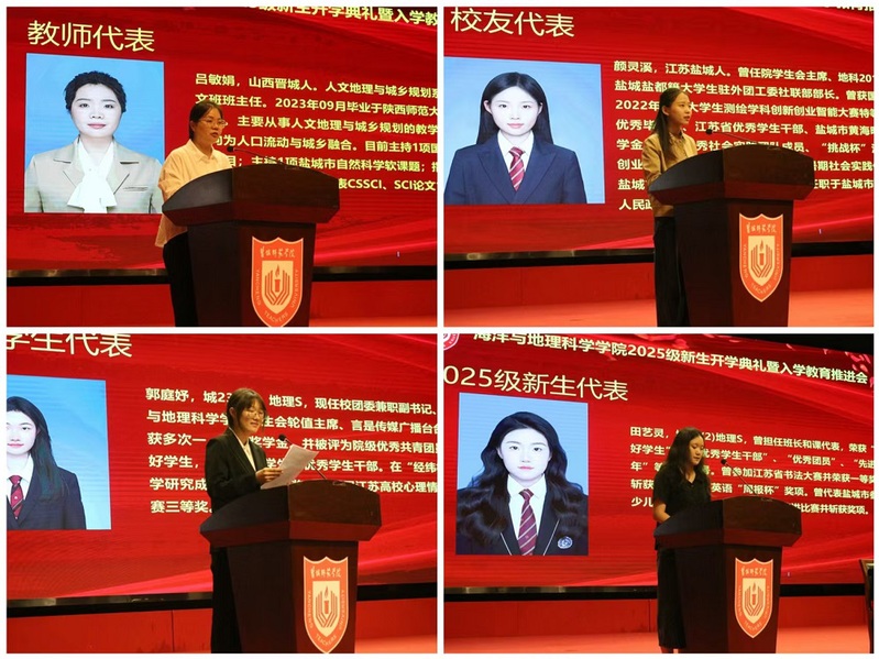 教师代表、人文246班班主任吕敏娟分享自身成长历程。优秀校友代表,学院2024年考取江苏省委组织部选调生的颜灵溪以学姐的身份分享了在盐师校训引领下成长的心路历程。老生代表、校团委兼职副书记、院学生会主席、地科232班郭庭妤同学,新生代表、地科252班田艺灵同学分别发言。开学典礼在《盐城师范学院校歌》声中落下帷幕。