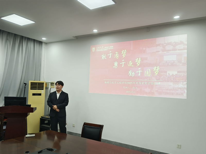 10月12日,物理与电子工程学院国家奖学金答辩展评会在逸夫实验楼东215会议室举行。学院党委副书记唐杰以及全体辅导员、16位候选同学和近30位学生代表参加会议。