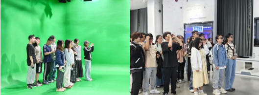 在长三角数字视听产业基地展厅,企业工程师系统介绍短视频与人工智能产业的发展现状与未来趋势,帮助学生形成对行业前景的直观认识。随后,师生走进技术体验区,依次参观并体验偏振3D大屏、AI数字人建模、多人动捕采集、XR数字影棚等前沿技术展示区域。在3D真人手办区,同学们近距离了解了基于光学采集与AI建模的快速人像数字化流程;在绿幕特效区,大家亲身参与虚拟拍摄与实时合成环节,感受数字内容创作的科技魅力。