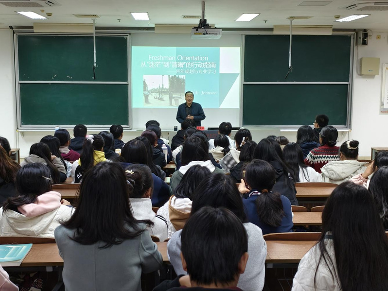 10月21日晚,外国语学院特邀学院离退休教师袁益山为2025级英语师范专业全体新生带来主题为《从“迷茫”到“清晰”的行动指南》的生涯教育讲座,学院党委副书记宋传盛主持活动。