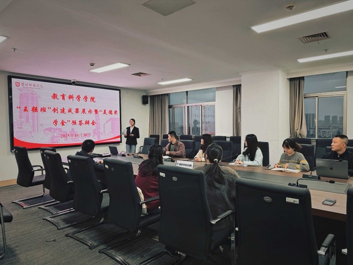 10月30日下午,教育科学学院在通榆校区主楼11楼新会议室举办2025年“王强班”创建成果展示暨“美德奖学金”预答辩会。学院党委书记杨日晨,全体辅导员出席会议并组成评委小组,“王强班”创建代表班级负责人及“美德奖学金”推报候选人依次参与成果展示与预答辩。