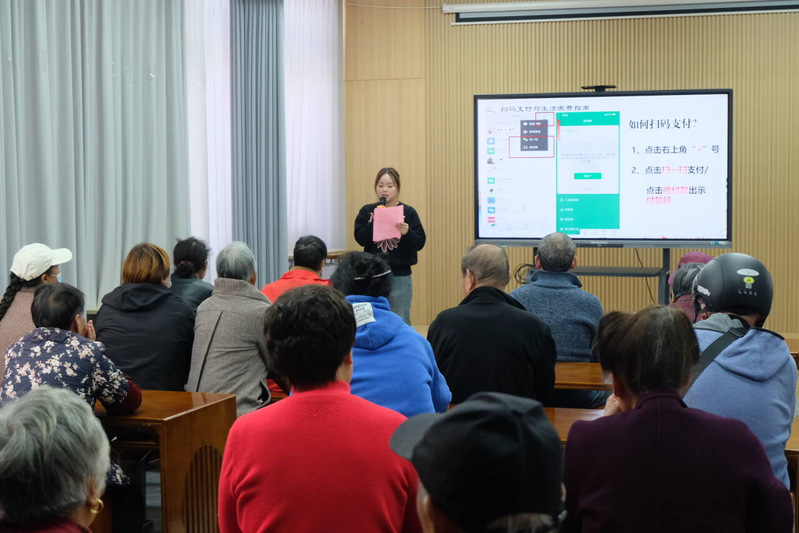 活动中,主持人详细介绍“科技助老+文化传情”活动的核心主题与目的。在数字科普讲座中,志愿者以大屏演示结合“一对一辅导”,聚焦老年人高频生活需求,系统讲解智能手机实用功能,帮助老年人提升生活技能。志愿者还提醒居民警惕“代办养老金”“保健品虚假宣传”“高息投资”等常见骗局,帮助老年人守好“钱袋子”。在文艺汇演环节,志愿者以生动有趣的小品展现老年人生活场景,既增添了活动的趣味性与感染力,也通过文艺表演传递孝亲敬老情感,现场氛围温馨热烈。
