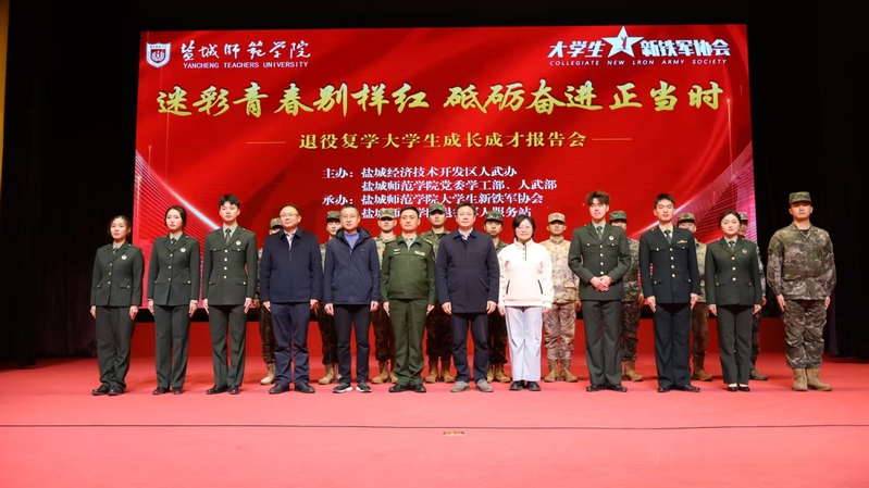 11月19日下午,“迷彩青春别样红 砥砺奋进正当时”退役复学大学生成长成才报告会在我校新长校区大学生活动中心举办。学校党委常委、副校长张桂华,盐城经济技术开发区党工委委员、人武办主任于成海出席报告会。