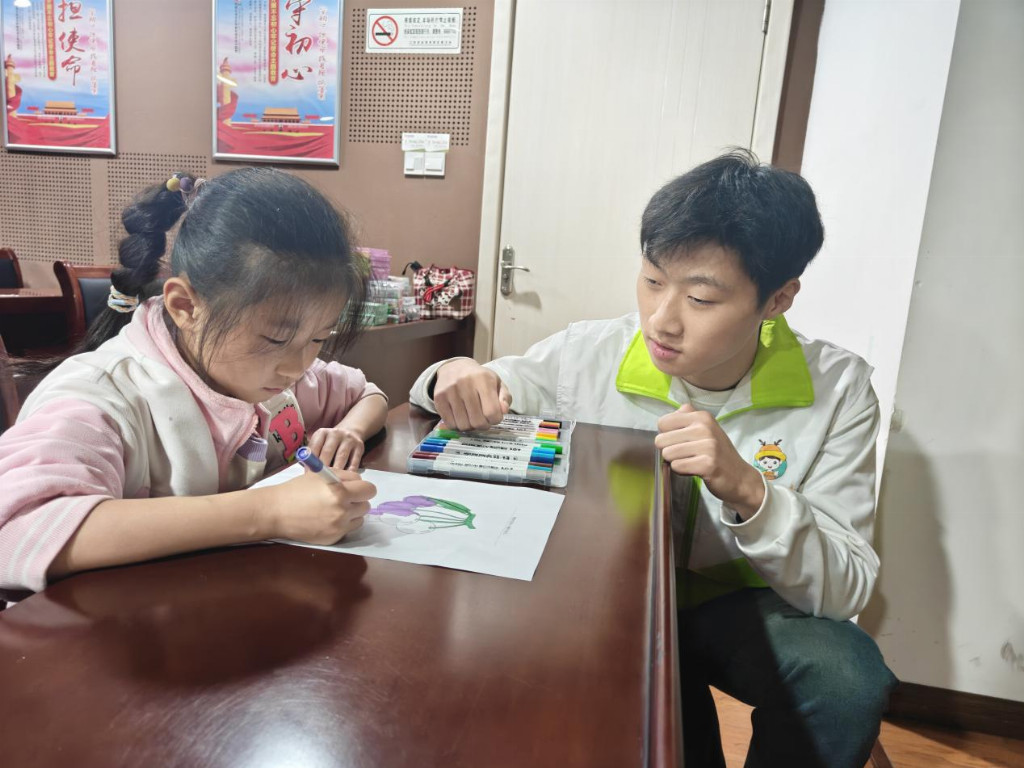 盐城师范学院商学院的志愿者们化身“暖心大朋友”,与孩子们开展多样互动。在绘画课堂上,志愿者耐心指导孩子用画笔勾勒缤纷世界;在益智游戏区,志愿者和孩子一起在飞行棋的“闯关”里欢笑,在围棋对弈中锻炼思维。这些一对一的陪伴,不仅为孩子带来了欢乐,更在潜移默化中传递着关爱与温暖。