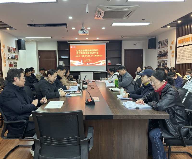 11月19日下午,文学院在通榆校区教学主楼B611会议室召开全体教师会议,开展“以教育家精神铸魂强师,谱写教育强国建设华章”师德师风建设主题教育活动。