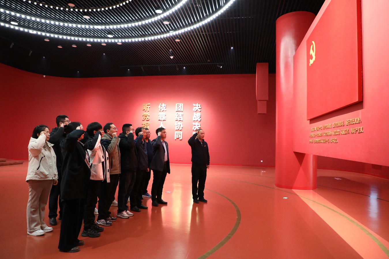 在淮海战役烈士纪念塔前,全体党员整齐列队,肃立鞠躬,深切缅怀革命先烈的丰功伟绩。环绕纪念塔一周,两侧浮雕生动刻画了军民同心、奋勇直前的壮阔场景,在场党员为“听党指挥、依靠人民”的淮海精神所震撼。在淮海战役纪念馆内,党员们通过珍贵文物、历史影像与详细讲解,重温那段波澜壮阔的岁月。面对鲜红党旗,全体党员庄严举起右拳,重温入党誓词。铿锵誓言回荡在厅内,既是对英魂的告慰,亦是对初心使命的铮铮承诺。
