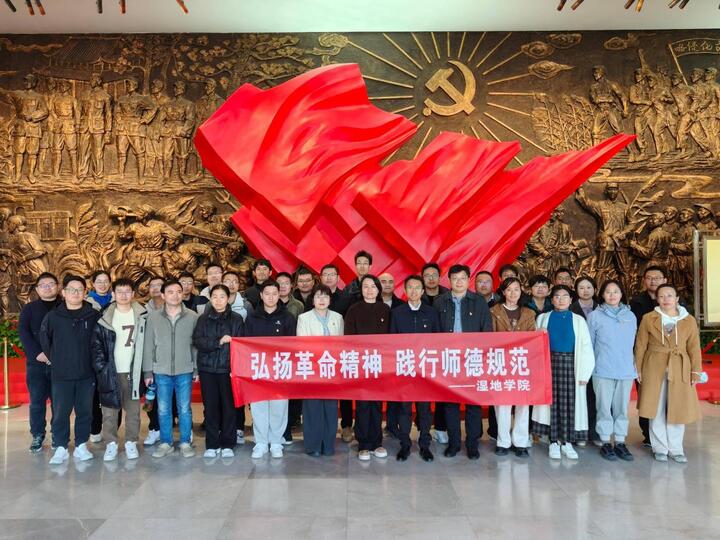 在潘黄烈士纪念馆,教师们通过实物展陈和场景复原,系统学习盐阜地区革命斗争史。宣誓环节中,全体教师面向党旗重温教师誓词,将“为党育人、为国育才”的使命融入红色基因传承。湿地学院党总支书记宋燕萍强调,“新时代师德建设既要传承先烈精神,更要紧扣乡村振兴国家战略”。
