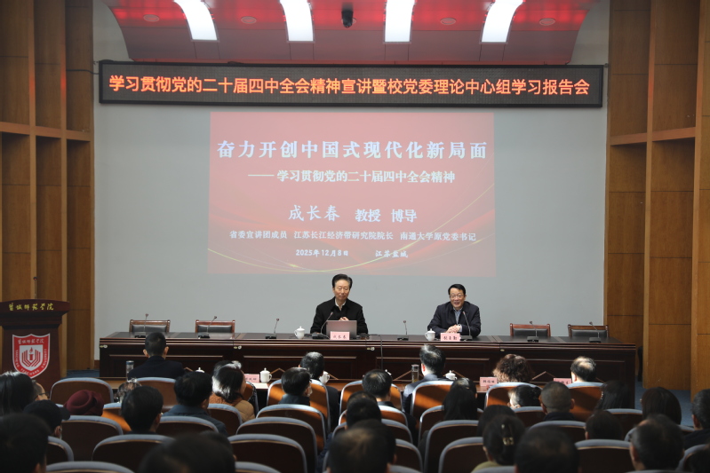 12月8日下午,我校举办学习贯彻党的二十届四中全会精神宣讲暨校党委理论学习中心组学习报告会,省委宣讲团成员、南通大学原党委书记、江苏长江经济带研究院院长、江苏省习近平新时代中国特色社会主义思想研究中心特约研究员成长春教授作题为《奋力开创中国式现代化新局面》的专题报告。学校党委书记张玉勤主持会议并作总结讲话。