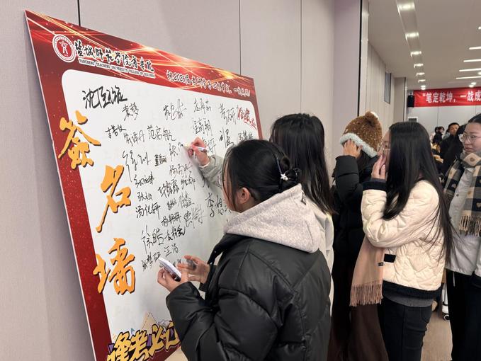 会前,考研学子纷纷在“上岸签名墙”上签名留念。财管228班沈佳璇、旅管2214班袁梓毓作为考研学生代表分享备考心得。学院还为考研学子准备了暖心慰问礼包,寓意一战“橙”硕、“笔”下生辉。