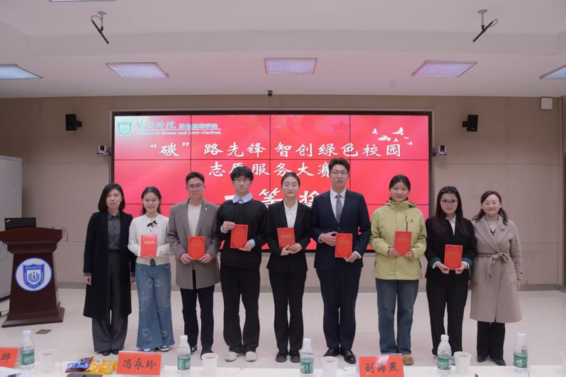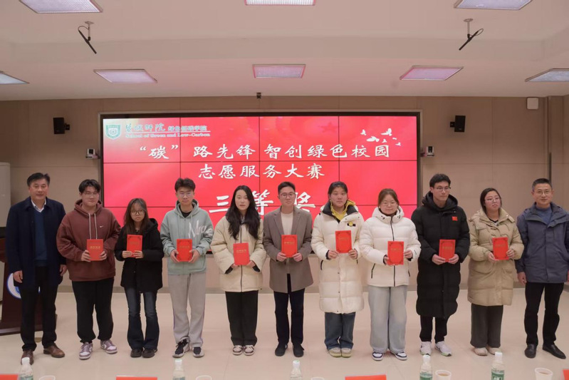赛后,评委高度肯定大赛的育人成效与创新价值,认为参赛作品深度契合绿色发展议题,充分展现出青年学子以专业智慧赋能绿色校园建设的探索精神与实践能力。根据评委综合评议,绿色低碳学院、化学与环境工程学院、马克思主义学院荣获一等奖;商学院、数字经济学院等7个学院获得二等奖;外国语学院等9个学院获得三等奖。与会嘉宾为获奖团队颁奖并合影。