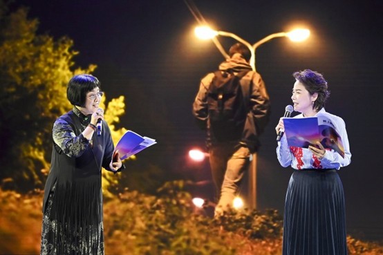 著名表演艺术家丁建华这是第二次参加义海的诗歌朗诵会。2015年她曾参加义海创作三十年诗歌朗诵会。丁建华这次朗诵了义海的作品《金鱼的墓碑》,并与义海合作朗诵了《西茉纳之歌·流浪》。丁建华在朗诵艺术上精益求精的艺术精神,深深感染了在场的每一位听众。朗诵结束后,丁建华说:“朗诵,是让文字获得第二次生命的过程。今天,当我再一次站在盐城的舞台上,用声音走进义海老师的诗歌世界,依然能感受到那份纯粹的艺术震颤。从《西茉纳之歌·流浪》的流动与诗意,到《金色的墓碑》的庄重与深刻,每个字都承载着情感的力度,美学上的纯粹。声音的艺术,是分寸,是理解,更是对创作者最深的致敬。感谢诗歌,感谢这片土地,让我们在同一个时空,共同抵达远方。”