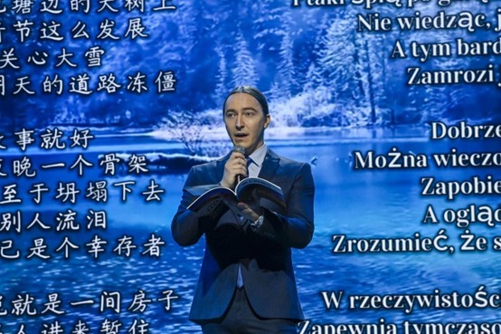 来自省内外的朗诵艺术家祁智、李宁、吴瑛、张玮、朱强、夏从松、秦九红、江华、乐守红等,以各自独特的朗诵风格,使义海的诗歌得到完美的“二度创作”。江苏省作协副主席祁智,既是著名诗人和儿童学文学作家,也是朗诵家,他对《草原,我最美的床》的独到处理,成为朗诵会的亮点之一。来自省内外的民谣歌手小渊、子荀、陶泥则用民谣弹唱的形式,实现了新诗与民谣弹唱的风格化融合。来自波兰的汉学家傿静安(Zywczok Jan Jakub)用中文和波兰语朗诵了义海的诗《冬夜读小说》,使得这台朗诵会平添了“一带一路”元素。朗诵会上,盐城师范学院文学院播音与主持系同学展现了他们扎实的专业素养,他们朗诵了义海以驯鹤女孩徐秀娟事迹为题材的情景抒情诗《有个女孩她曾经来过》,该作品在2024年的江苏省大学生艺术展演上等获得朗诵专业组特等奖。