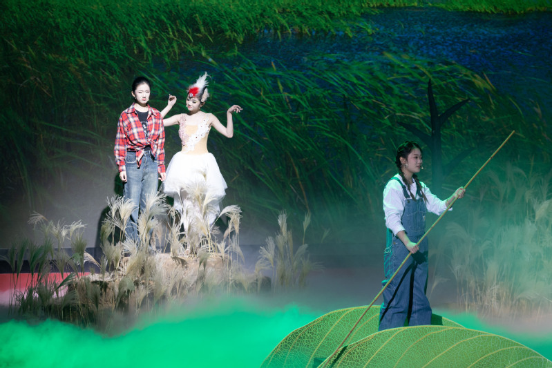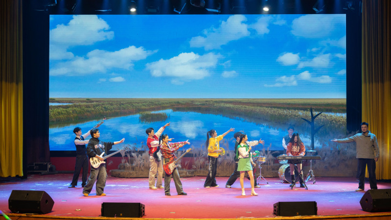 该剧曾获盐城市精神文明建设五个一工程奖,时隔五年后经师生重新创排再登校园舞台,经过时光的沉淀让剧目所承载的文化内涵更加厚重,校园经典在传承中焕发出新的生机。剧目是以盐城黄海湿地为背景,围绕高校乐队成员程曦救助丹顶鹤“曦曦”的经历展开,展现了人与自然和谐共生的美好画卷。从“救鹤”到“卖鹤”,从“恋鹤”到“护鹤”,扣人心弦的情节主线背后,是对人性的深刻叩问,更是对生态文明理念的生动诠释。该剧深情回述了中国首位环保烈士徐秀娟的英雄事迹。演出现场,观众仿佛被带入盐城湿地珍禽国家级自然保护区,那份守护自然的赤诚在歌声与对白中直抵人心,赢得全场阵阵喝彩和热烈掌声。演出过程中,社会主义核心价值观贯穿始终,既彰显了当代中国精神,也为青年学子上了一堂生动的生态教育课。