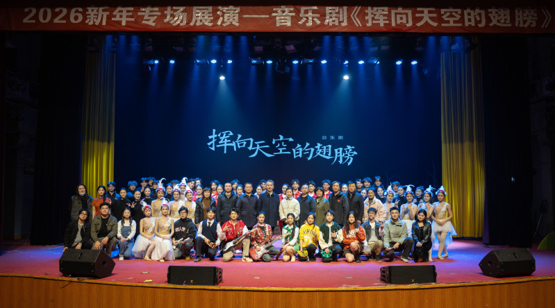 时序更替,华章日新。12月29日下午,我校在大学生活动中心举办 2026新年专场展演——音乐剧《挥向天空的翅膀》。学校党委副书记于建江同现场500多名师生欢聚一堂,共同观看演出,共迎新年的到来。