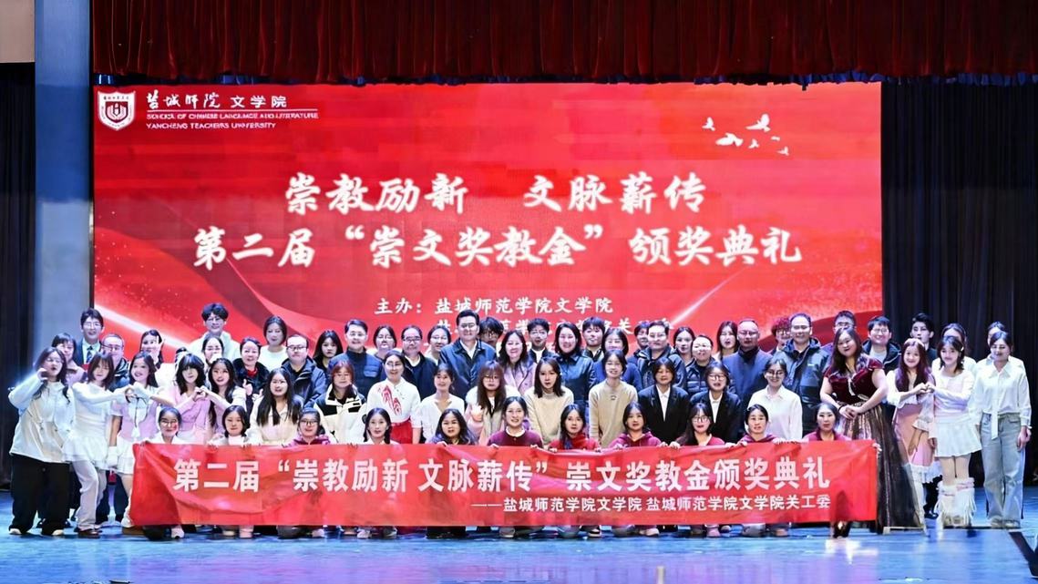 12月30日,文学院第二届“崇文奖教金”颁奖典礼在新长校区音乐厅举行。学校关工委副主任、教育发展基金会副理事长庞波,“崇文奖教金”捐献者、中文83届校友、盐城师范学院教育发展基金会理事、无锡市蔚联钢铁有限公司总经理严峰夫妇受邀出席。文学院党政领导班子全体成员以及师生代表共计400名师生代表参加典礼。