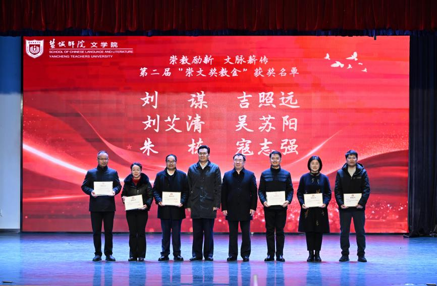 庞波、严峰共同为第二届“崇文奖教金”获奖教师刘谋、吉照远、刘艾清、吴苏阳、朱栋、寇志强颁奖并表示祝贺。