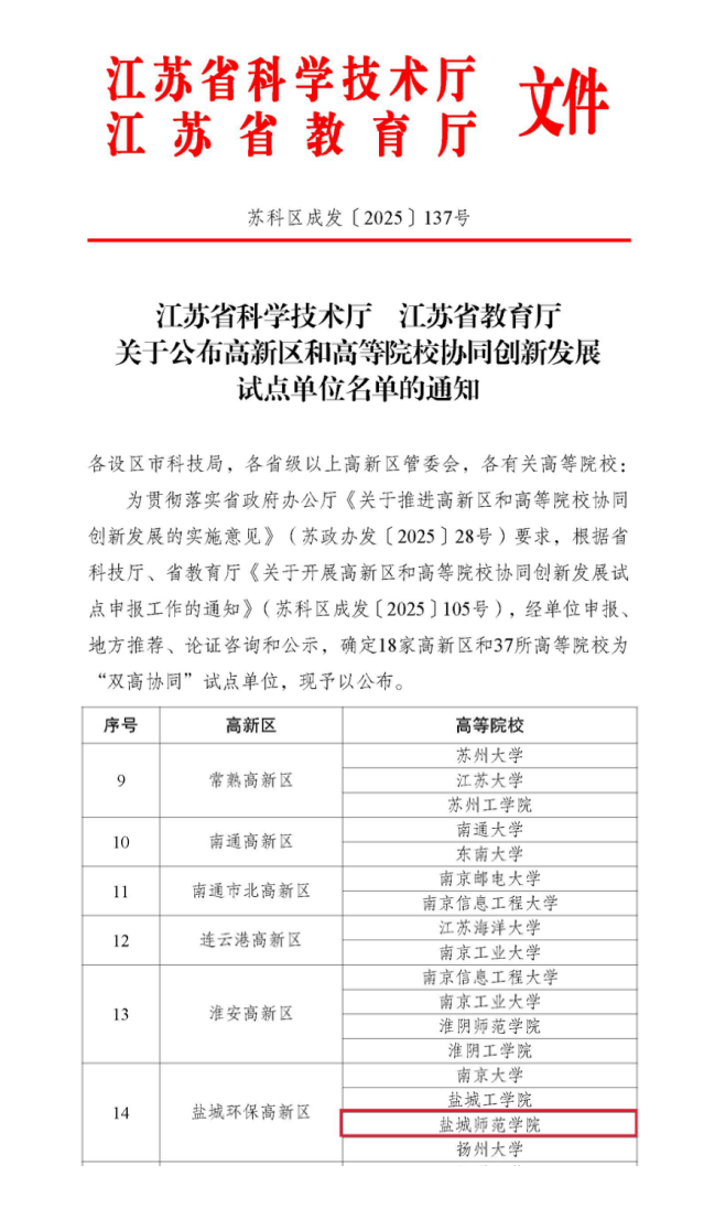 入选全省首批“双高协同”创新发展试点单位,“双高协同成果超市”上线成果20多项。获批省产学研合作项目41项,技术合同成交额超1亿元。获评省高校知识产权工作先进集体。与盐城合作共建国际传播与区域国别研究中心、盐台融合发展研究中心。沿海发展智库入选国家级权威“AMI智库”,相关成果被全国政协办公厅采纳、获中央政法委书记肯定性批示。