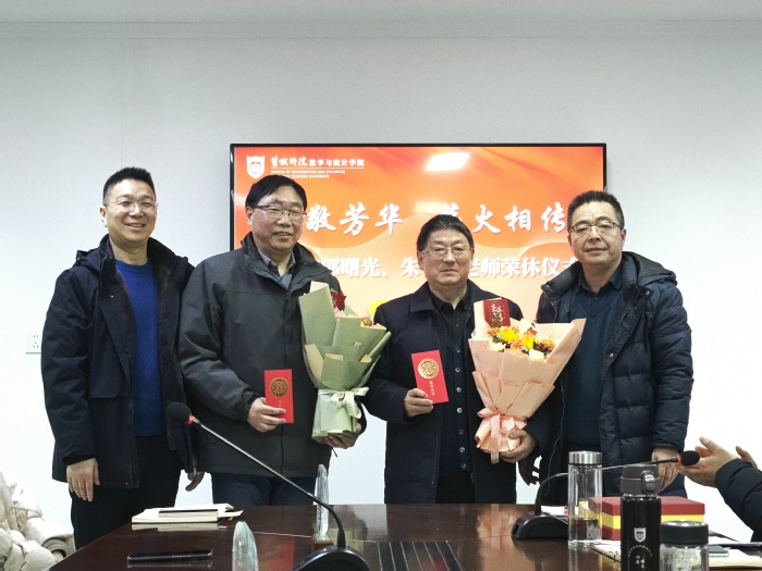1月21日下午,数学与统计学院举行“致敬芳华,薪火相传”教师荣休仪式。学院党政领导班子,荣休教师郭曙光、朱世平,全体教师出席仪式,党委副书记左飞主持仪式。