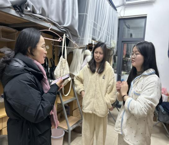 近日,马克思主义学院党委副书记吴惠与辅导员胡润之、华小蕾及部分学生干部分别深入学生宿舍,开展寒假前综合走访活动,将安全检查、防诈警示、就业指导等服务送至学生身边,并为同学们准备了暖意十足的“寒假平安礼包”。