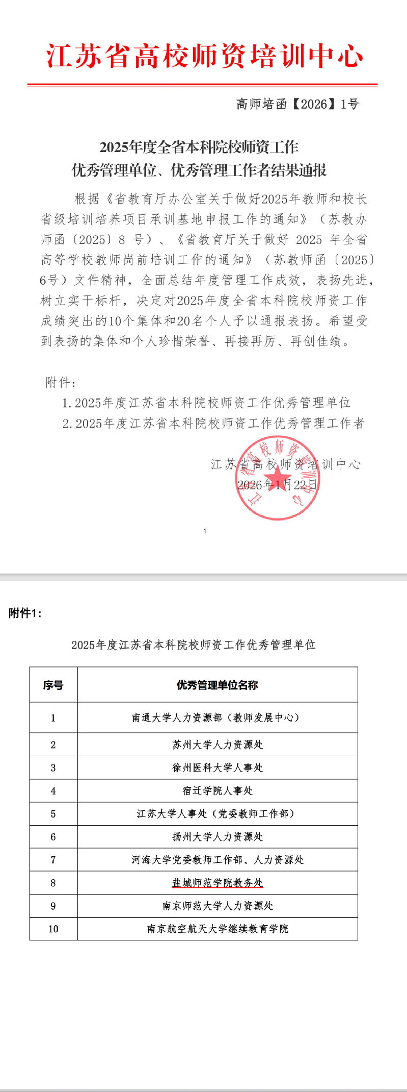 近日,江苏省高校师资培训中心公布2025 年度全省本科院校师资工作优秀管理单位评选结果,我校教务处成功入选,全省仅10 家单位获此荣誉。