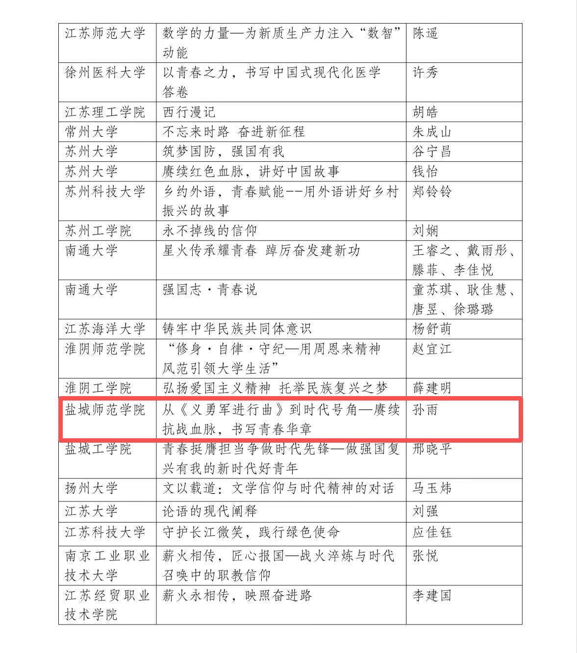 近日,共青团江苏省委正式发布了2025年“信仰公开课”省级精品课评选结果,经校团委推荐与团省委遴选,我校选送的由海洋与生物工程学院孙雨老师主讲的《从<义勇军进行曲>到时代号角——赓续抗战血脉,书写青春华章》课程成功入选省级精品课。