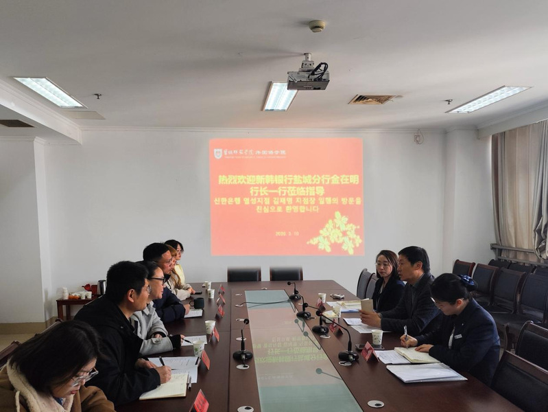 3月10日下午,外国语学院党委书记张宾州、党委副书记宋传盛、朝鲜语系主任梁海胜,热情接待了新韩银行盐城分行行长金在明、副总经理辛丽花、营业主管柏莹莹一行,双方围绕校企合作相关事宜开展深入交流座谈。