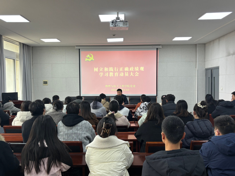3月13日下午,物理与电子工程学院党委在逸夫楼东楼214会议室召开树立和践行正确政绩观学习教育动员大会。学院党委书记刘洋出席会议并作动员讲话,党委副书记、院长张志海,副院长朱成云,各党支部书记,全体辅导员及学生党员参加会议。