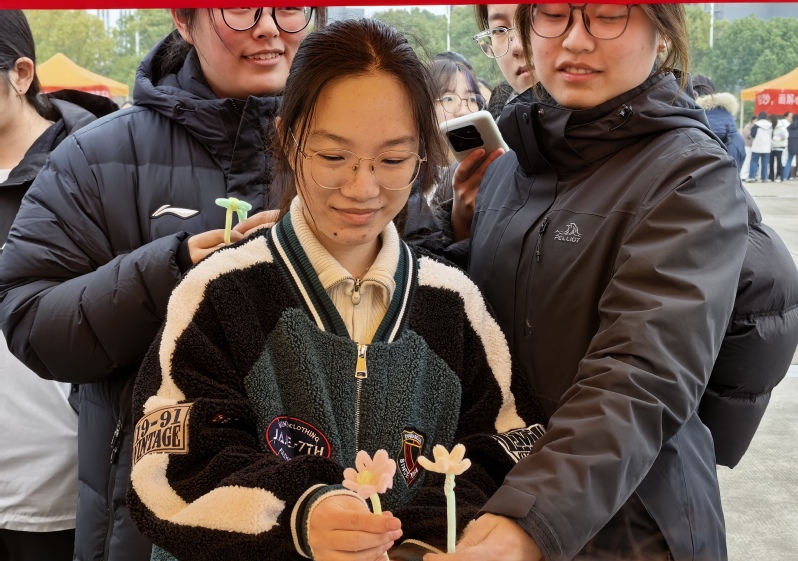 以“春醒花开”为灵感,用扭扭棒塑形创作,在指尖缠绕中释放情绪压力。指尖的反复缠绕过程,如同对负面情绪的梳理与释放,不少同学在创作中坦言:“把烦恼拧成花的形状,好像压力也跟着变柔软了。”这种具象化的艺术表达,帮助大家在动手实践中实现情绪调节与压力舒缓。