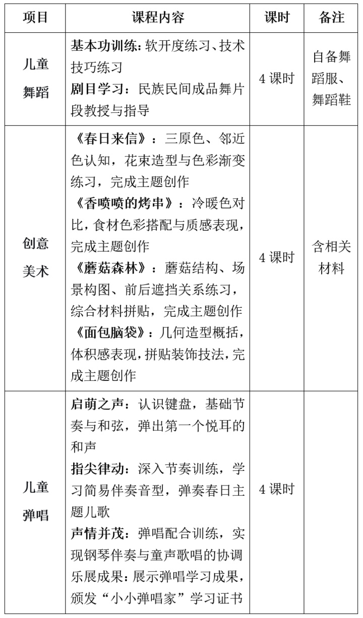 本次春假艺术托管营打破单一学科限制,一个班,三项全能——舞蹈、美术、弹唱三天全覆盖,共12课时,每半天两个项目,每个项目2课时。具体课程内容汇总如下: