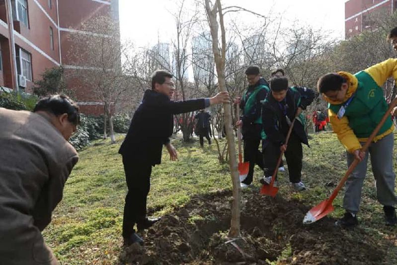 春风拂面,万物复苏。3月14日下午,校园内欢声笑语,铁锹与水桶交织成一曲绿色的交响。在第48个植树节来临之际,盐城市第一中学联合盐城市生态环境科学研究会、江苏仁禾中衡咨询集团、新四军纪念馆“东进”志愿者服务队共同举办了“播种绿色希望,传承生态薪火”植树节志愿服务活动。盐城市第一中学党委书记、校长陈建权和盐城市生态环境研究会顾问于长陆、江苏仁禾中衡咨询集团志愿者宋子尧、新四军纪念馆“东进”志愿者宋钰等嘉宾以及60余名学生志愿者,共同种下春天的希望,传承红色与绿色的薪火。