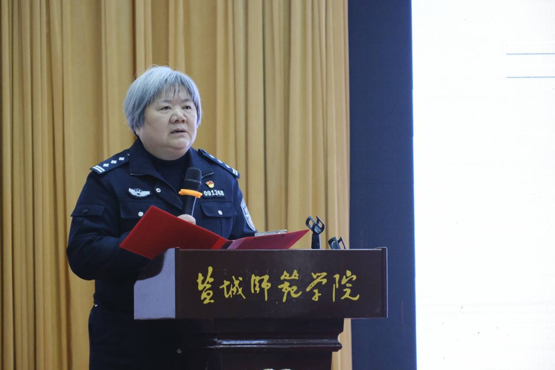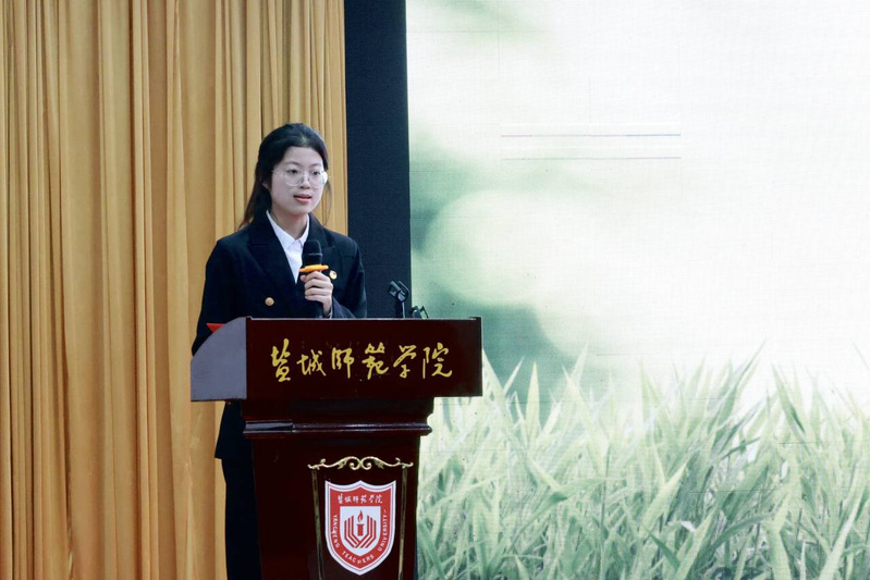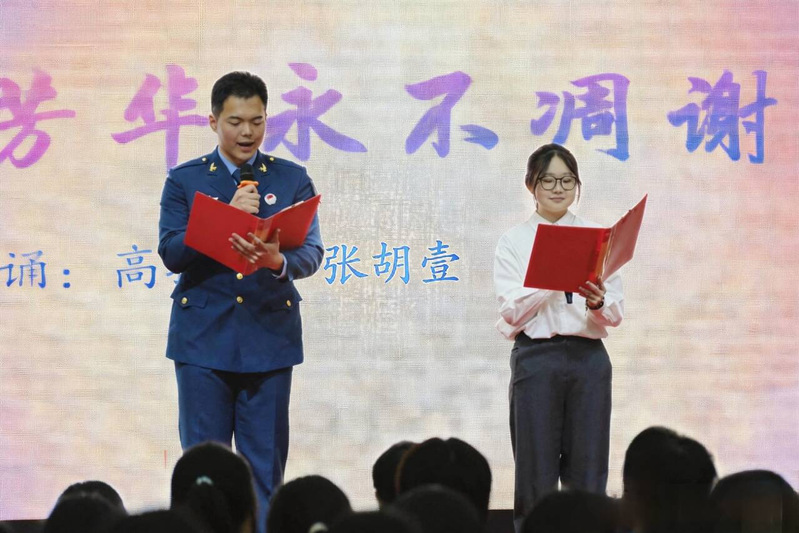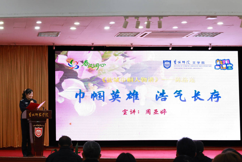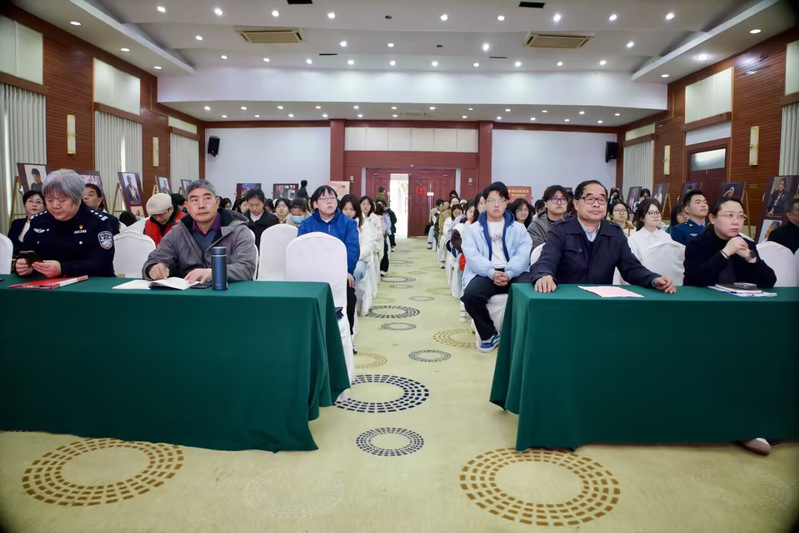 活动现场,分局关工委副主任刘婵详细讲述“百岁抗战老兵肖像摄影展”的创作历程,为大家解读影像背后的坚守与信仰;师生共同观摩《红色印记公安情:寻根》视频,体悟红色血脉传承力量;文学院学生高振嘉、张胡壹深情朗诵《血色芳华永不凋零》,致敬革命先烈;鹤翔关爱工作站周亚婷宣讲了《陈洛涟:巾帼英雄浩气长存》,深情讲述了盐城抗战英雄的感人事迹。同时,党五十年纪念章获得者范玉喜和盐城市平安法制团宣讲团成员董丽秋也联袂朗诵了《英雄》,将现场氛围推向了高潮;全场共同聆听了歌曲《当那一天来临》,红色血脉在词里曲间缓缓流淌。活动最后,文学院关工委常务副主任刘谋作总结讲话,分享活动感悟,对活动成效给予高度评价。